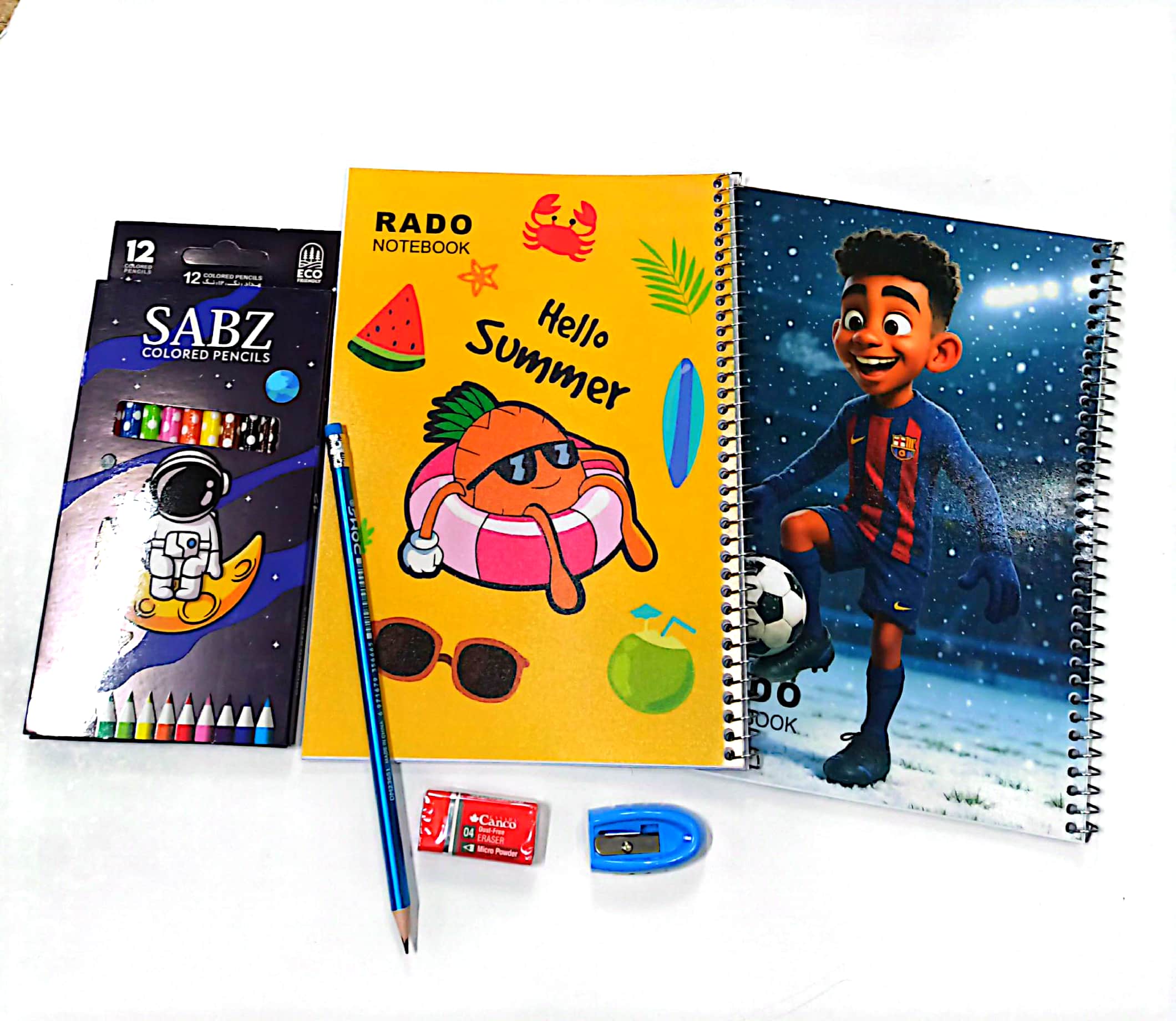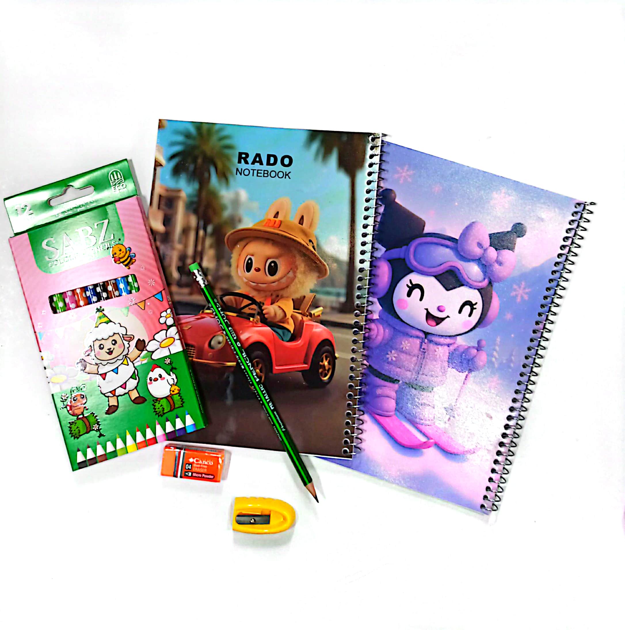 تعداد پک: 6تیکه،شامل :دفتر نقاشی برند رادو،دفتر مشق برند رادو،مداد رنگی 12رنگ برند سبز،پاکن برند کنکو،تراش برند وای پلاس ،مداد مشکی برند دامس